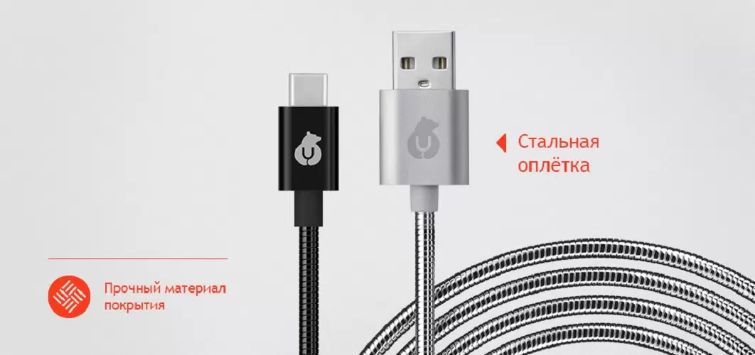 Кабель зарядный USB-C USB-A в стальной оплетке, серебро